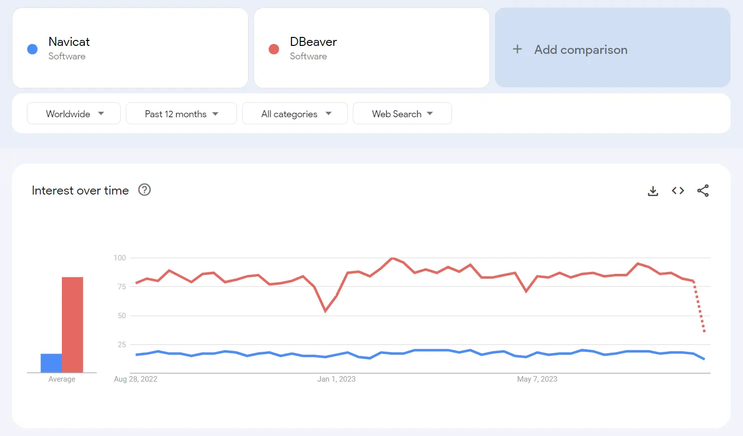 As per Google Trends, the interest for DBeaver is three times that of Navicat over the past 12 months.