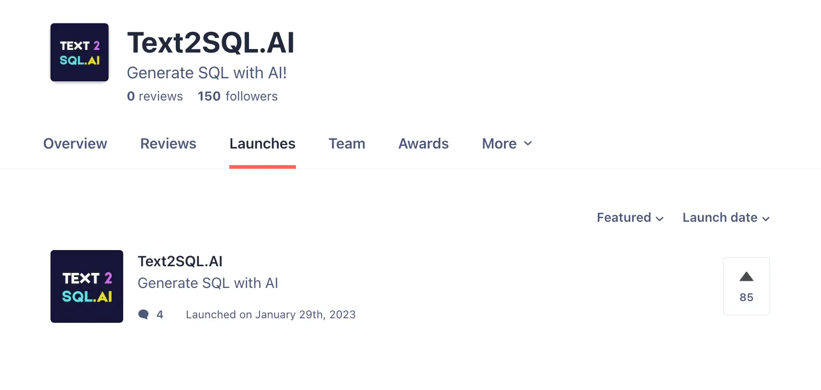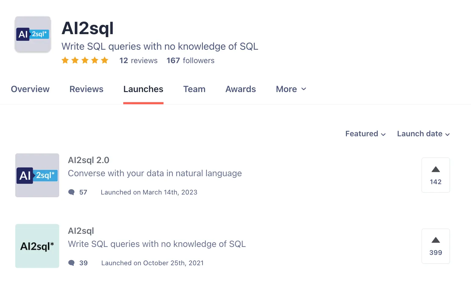 AI2sql's first launch in 2021 on Product Hunt ranked fifth for the day (which must have been quite impressive at the time). Two years later, version 2.0 was introduced with ChatGPT capabilities and received 142 Upvotes.